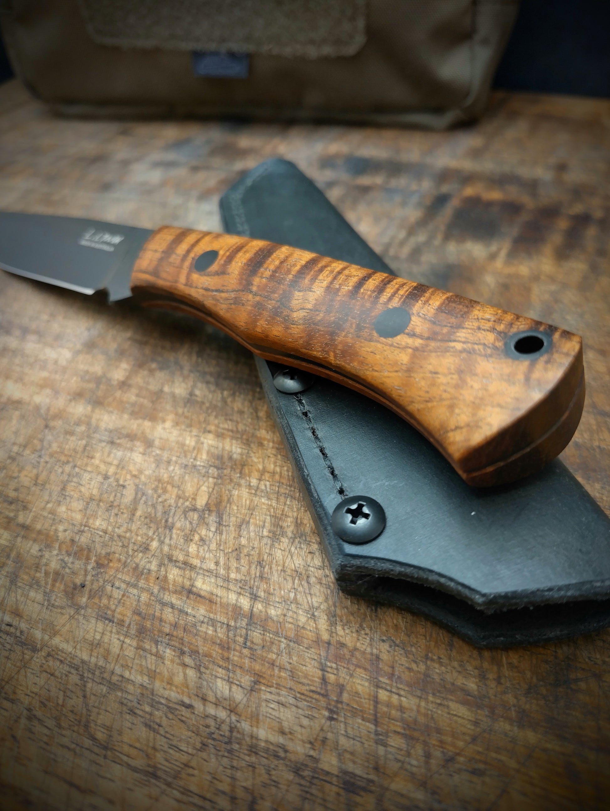 The knife comes with an ambidextrous leather pocket sheath made from Australian "crazy horse" leather. All L. Lynch sheaths are hand stitched for longevity ensuring that if one stitch is damaged the sheath retains structural integrity.